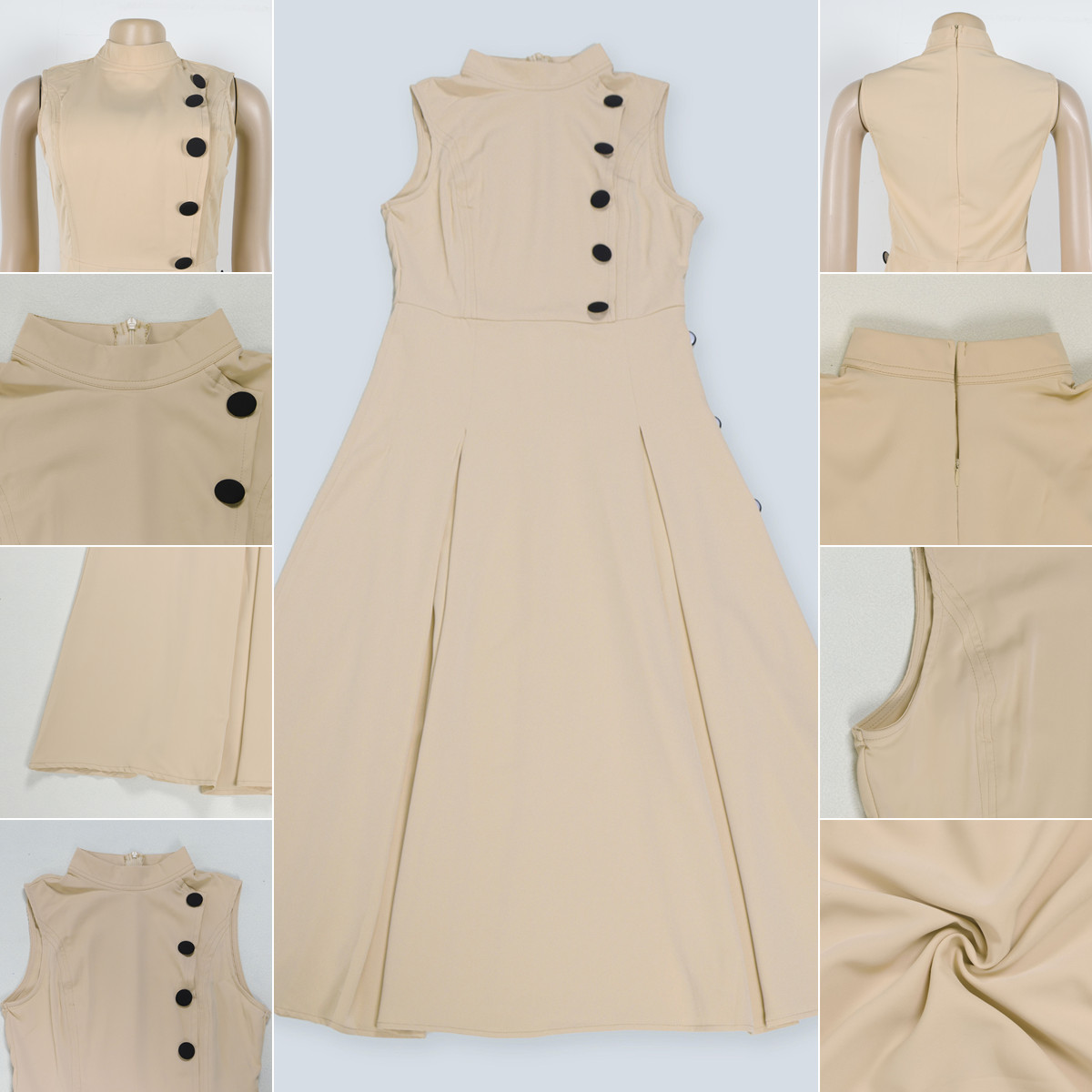 Crafted from breathable, lightweight fabric ideal for warm weather, it keeps you cool while maintaining a refined appearance throughout the day. The sleeveless cut adds a fresh, contemporary touch, making it suitable for office settings, business-casual events, or chic everyday outings. Front button details give the dress a stylish accent while adding to its structured elegance.
